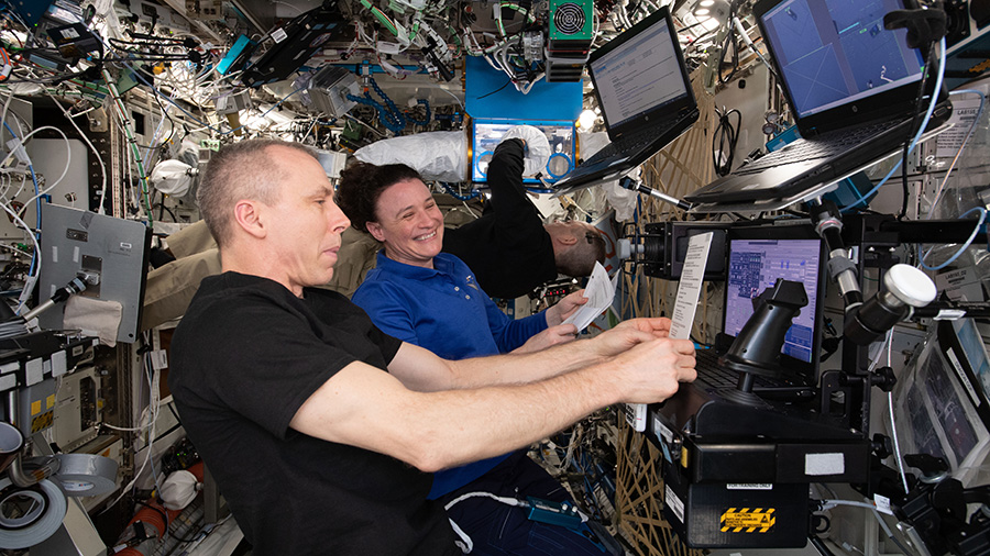 NASA astronauts Serena Auñón-Chancellor and Drew Feustel work a pair of different experiments aboard the International Space Station.