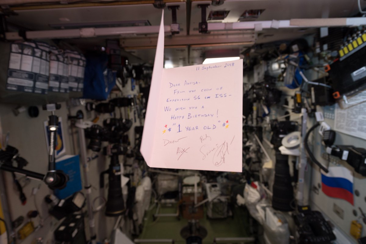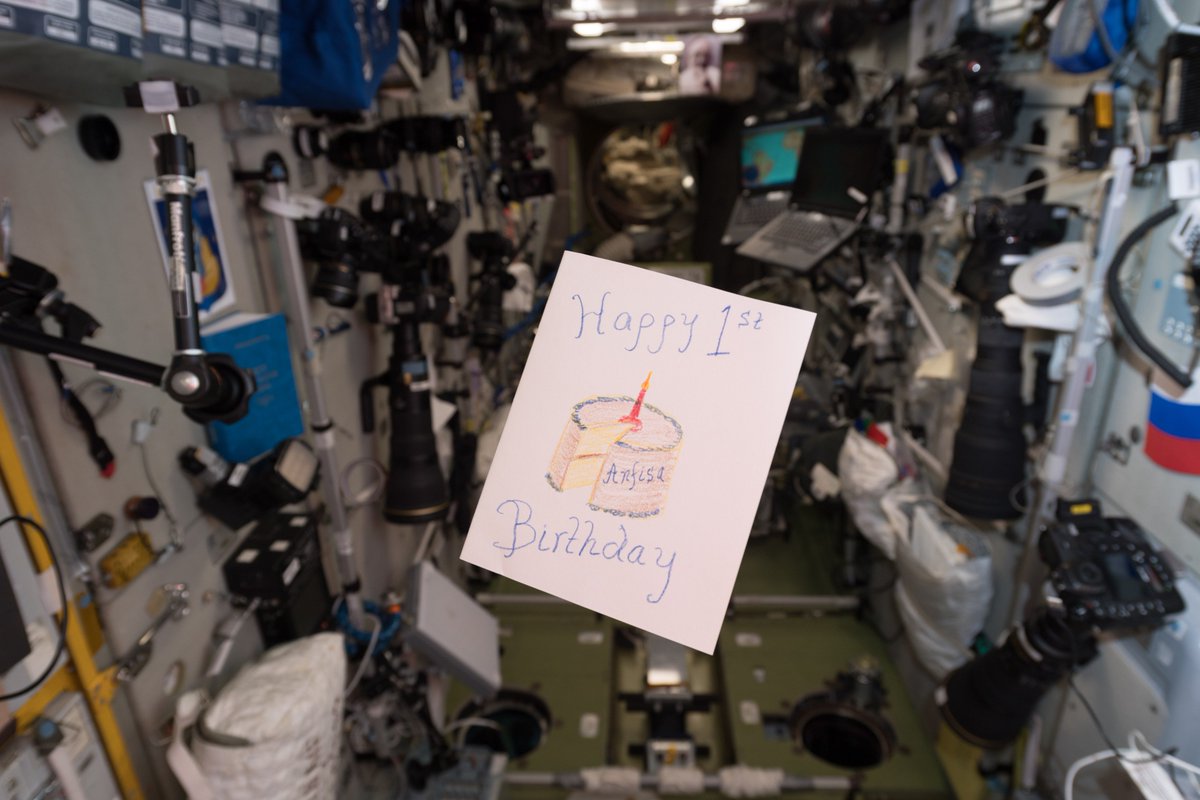 Here's a very important aspect of space flight: celebrating the bday of your crew mate's little daughter. Happy 1st bday Anfisa & congrats to our friend @OlegMKS! @Astro_Feustel made the card, the cake came in tubes, candle from a flash light & we sang happy bday in 3 languages.