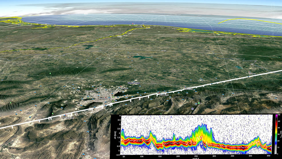 A photo fr om Google Earth of the mountainous area over Mexico where RainCube measured its first storm. The white line shows RainCube's flight path. The colorful graph in the bottom right shows the amount of rain produced by the storm, as seen by RainCube's radar.