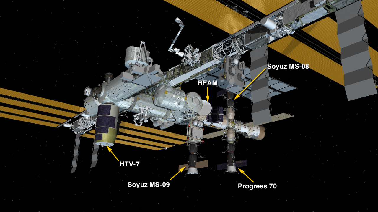 Sept. 27, 2018: International Space Station Configuration. Four spaceships are parked at the space station including the HTV-7 and Progress 70 resupply ships and the Soyuz MS-08 and MS-09 crew ships.