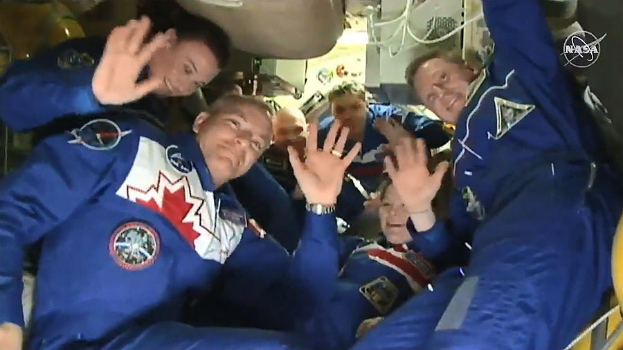 NASA astronaut Anne McClainDavid Saint-Jacques of the Canadian Space Agency, and Oleg Konenenko of the Russian space agency Roscosmos joined Expedition 57 Commander Alexander Gerst of ESA (European Space Agency), Serena Auñón-Chancellor of NASA, and Sergey Prokopyev of Roscosmos aboard the International Space Station when the hatches between the Soyuz spacecraft and the orbiting laboratory officially opened at 2:37 p.m. EST.