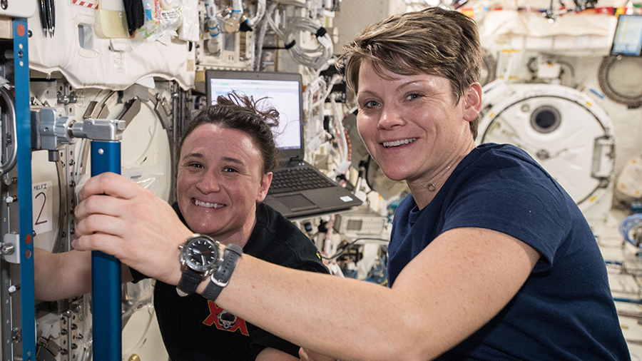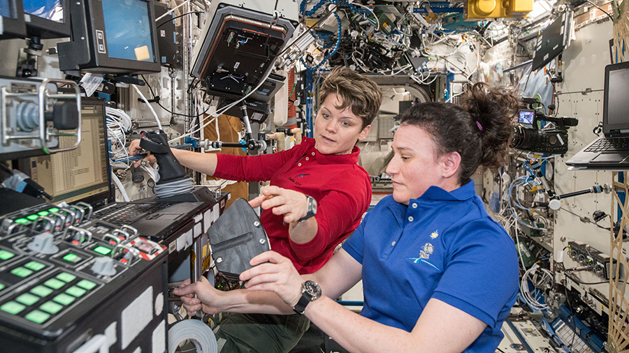 NASA astronauts Serena Auñón-Chancellor (background) and Anne McClain work inside the Japanese Kibo laboratory module cleaning vents to maintain air circulation aboard the International Space Station.