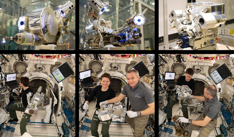 Top: RRM3 tools (left to right) — Visual Inspection Poseable Invertebrate Robot 2, Cryogen Servicing Tool, Multi-Function Tool 2 — during ground testing; Bottom: Astronauts Anne McClain and David Saint-Jacques pose with the corresponding RRM3 tools aboard the International Space Station.
