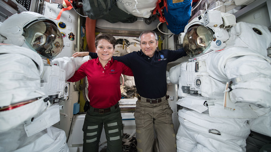 Astronauts (fr om left) Anne McClain and David Saint Jacques are pictured in between a pair of spacesuits that are stowed and serviced inside the Quest airlock wh ere U.S. spacewalks are staged.