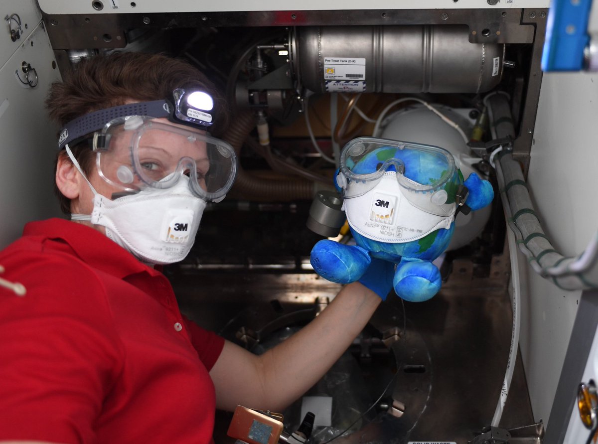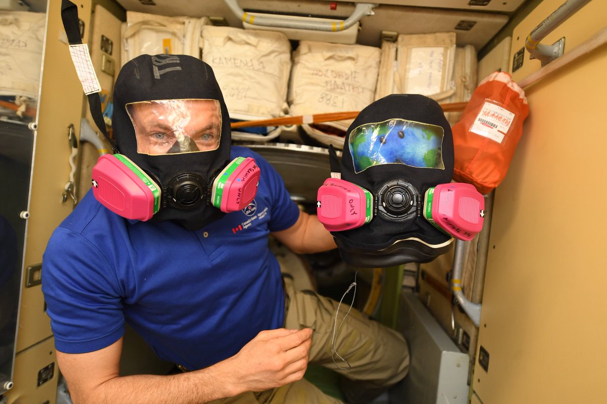 Earth's second day on @Space_Station started early, but he was happy to learn that even in space, the day starts off with coffee. Then it was emergency mask donning practice with @Astro_DavidS - if there's an (unlikely) ammonia leak, we have just seconds to protect ourselves.