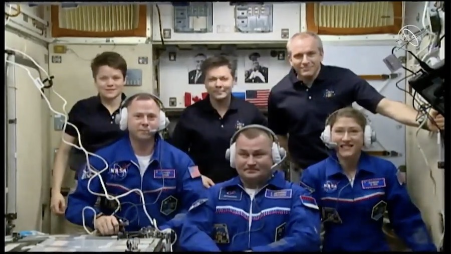 Expedition 59 crew members Anne McClain, Oleg Konoenko, and David Saint-Jacques welcome their new crew members, Nick Hague, Christina Koch, and Alexey Ovchinin, who arrived to the International Space Station on March 14, 2019. Image Credit: NASA TV