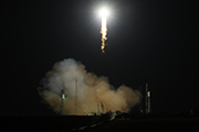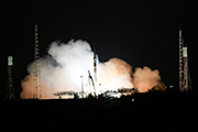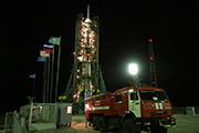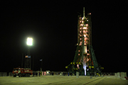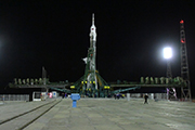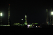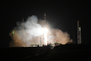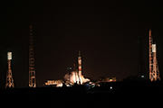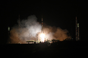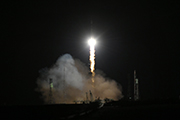 Under a cloudy sky, the Soyuz booster roared to life and climbed away from the Baikonur Cosmodrome in Kazakhstan at 3:14:08 p.m. EDT (12:14 a.m. Friday local time), roughly the moment Earth's rotation carried the launch pad — the same one used by Yuri Gagarin at the dawn of the Space Age — into the plane of the station's orbit.