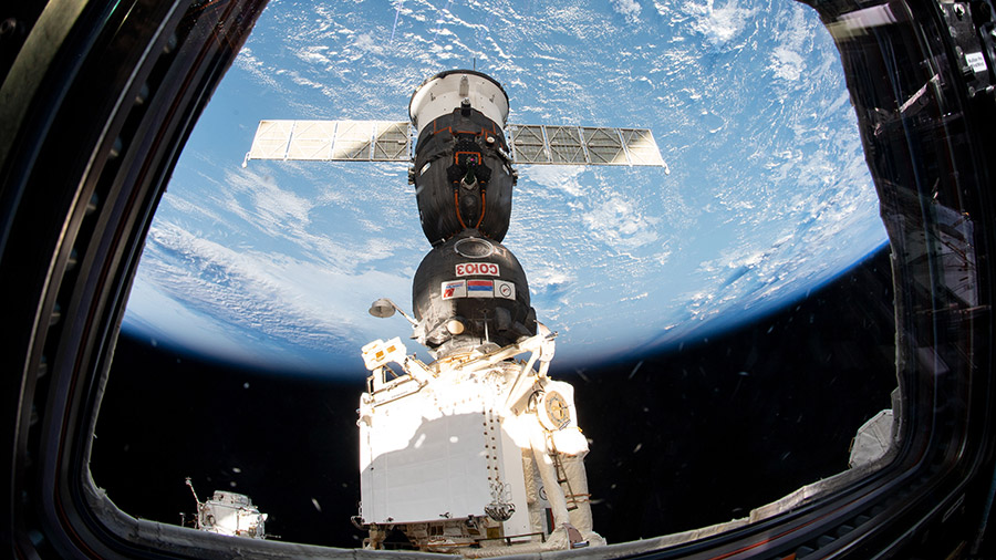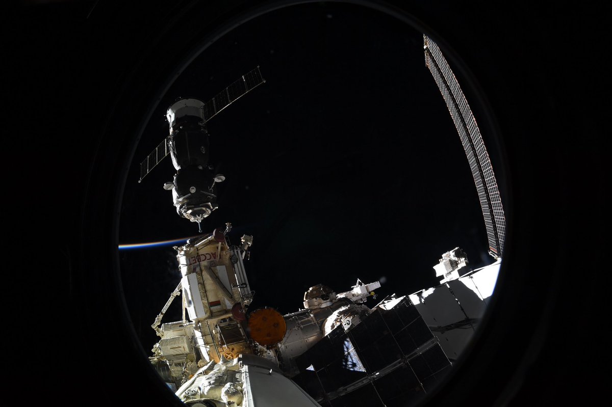 The Soyuz MS-12 spacecraft that launched three new Expedition 59-60 crew members to the International Space Station is pictured docked to the Rassvet module. Cosmonaut Alexey Ovchinin from Roscosmos commanded the Soyuz crew ship flanked by NASA astronauts Nick Hague and Christina Koch during the five-hour, 47-minute trip that began at the Baikonur Cosmodrome in Kazakhstan.