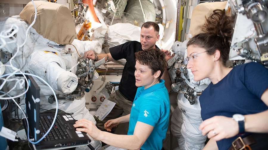 NASA astronauts Nick Hague, Anne McClain and Christina Koch (right) work on U.S. spacesuit maintenance in the Quest airlock of the International Space Station.