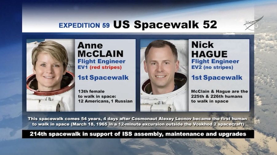 If all goes well, McClain and newly arrived crewmate Christina Koch will carry out the second battery replacement EVA next Friday, installing another se t of three lithium-ion batteries and adapter plates on the port inboard truss. In so doing, they will chalk up the first all-female space outing since cosmonaut Alexey Leonov carried out history's first spacewalk in 1965.