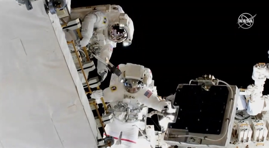 Astronauts Nick Hague (upper left) and Anne McClain work outside the International Space Station during a spacewalk Friday. Credit: NASA TV/Spaceflight Now