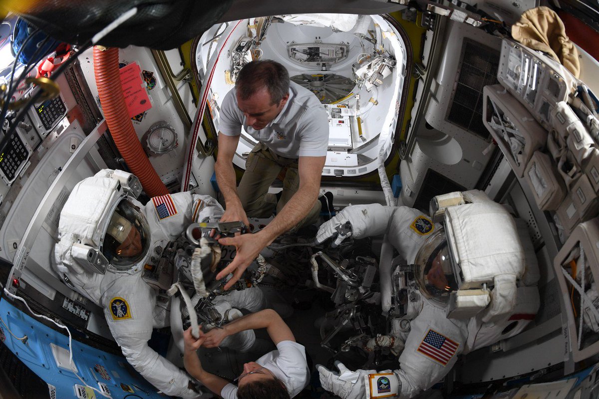 NASA astronaut Christina Koch (center) assists fellow astronauts Nick Hague (left) and Anne McClain in their U.S. spacesuits shortly before they begin the first spacewalk of their careers. Hague and McClain worked outside, in the vacuum of space, for six hours and 39 minutes on March 22, 2019, to upgrade the International Space Station's power storage capacity.