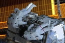 Flight controllers remotely operating the station's robot arm had already removed four of the older nickel-hydrogen batteries and installed three of the new lithium-ion batteries in slots one, three and five. Two older NiH2 batteries were still in place in slots two and four while the slot six was empty.