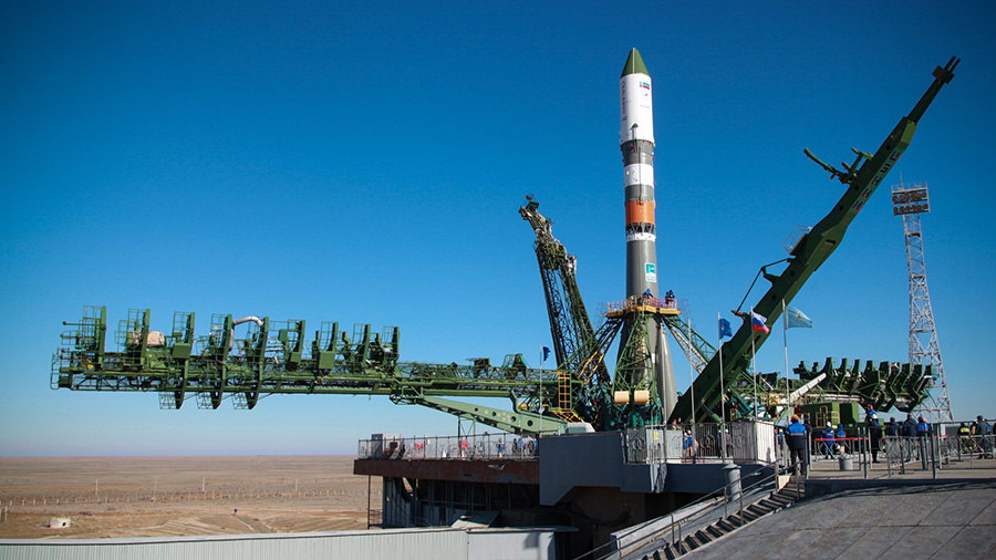 Russia's Progress 72 resupply rocket stands at its launch pad at the Baikonur Cosmodrome in Kazakhstan. Credit: Roscosmos