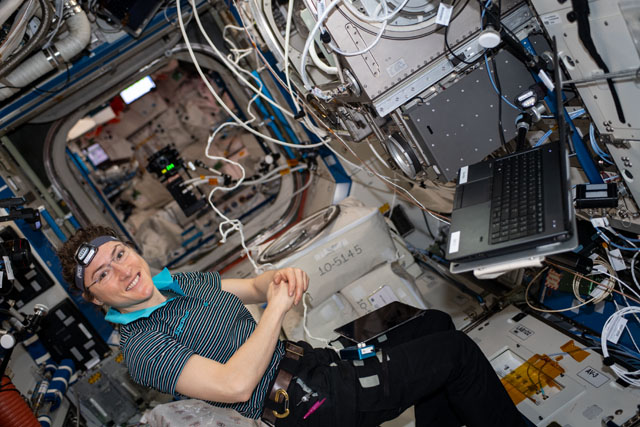 NASA astronaut Christina Koch sets up Fiber Optic Production, an investigation to create optical fibers in microgravity that may exhibit superior quality to those produced on Earth. Image Credit: NASA