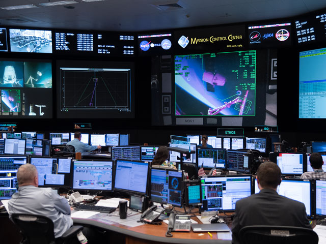 At the Mission Control Center in Houston, Expedition 59 flight controllers monitor the capture and berthing of the SpaceX Dragon cargo craft to the Harmony module of the International Space Station on May 6. Image Credit: NASA/Josh Valcarcel