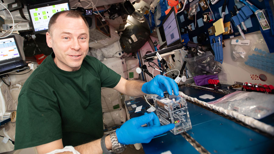 Flight Engineer Nick Hague worked solo during the morning exploring the benefits and risks of microorganisms living in a spacecraft. Hague first photographed samples of microalgae that may supplement the diet of future astronauts going to the Moon and beyond. Next, the NASA astronaut continued investigating why pathogens become more virulent in space posing a flight risk to astronauts.
