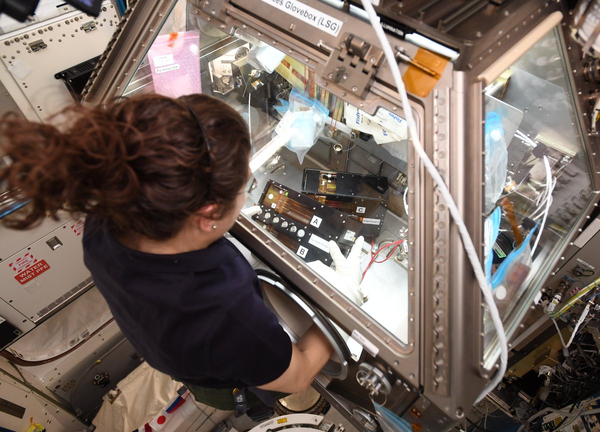Saint-Jacques and NASA astronaut Nick Hague also explored how weightlessness affects different microbiological phenomena. Hague inoculated culture bags inside the Life Sciences Glovebox for research operations to understand why pathogens become more virulent in space. Saint-Jacques checked DNA samples for the Genes In Space-6 experiment that explores how space radiation damages DNA and the cell repair mechanism.