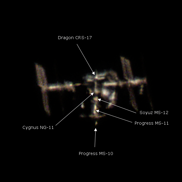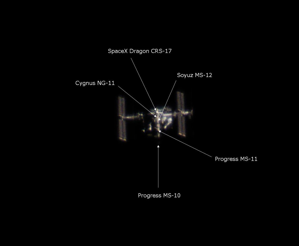 First imaging opportunity since March. Mixed result,40m/s jet stream had bigger impact on the visibility than I expected.#SpaceX Dragon CRS-17 and #Progress MS-10 are totally visible, the rest maybe.Tonight round 2 with hopefully better seeing conditions. http://www.spacestationguys.com