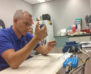 CSA astronaut David Saint-Jacques preparing a sample during pre-flight training at Johnson Space Center.