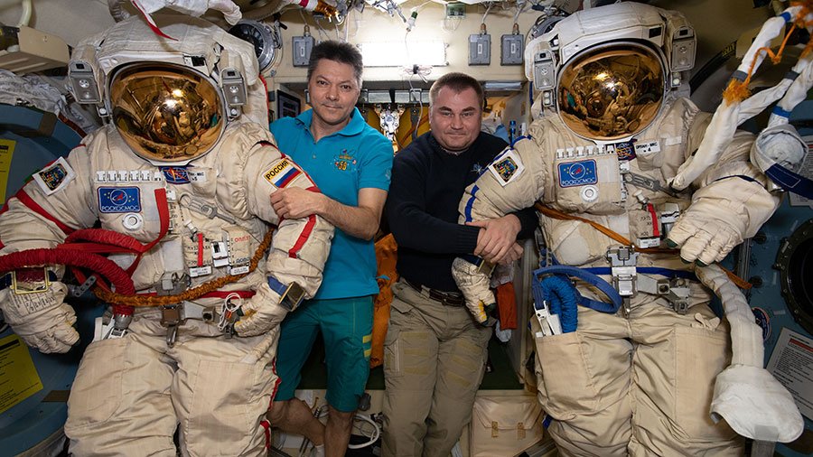 Both spacewalkers are wearing Russian Orlan spacesuits. Kononenko is designated extravehicular crew member 1 (EV1), wearing the suit with red stripes, and Ovchinin is EV2, in the suit with blue stripes.