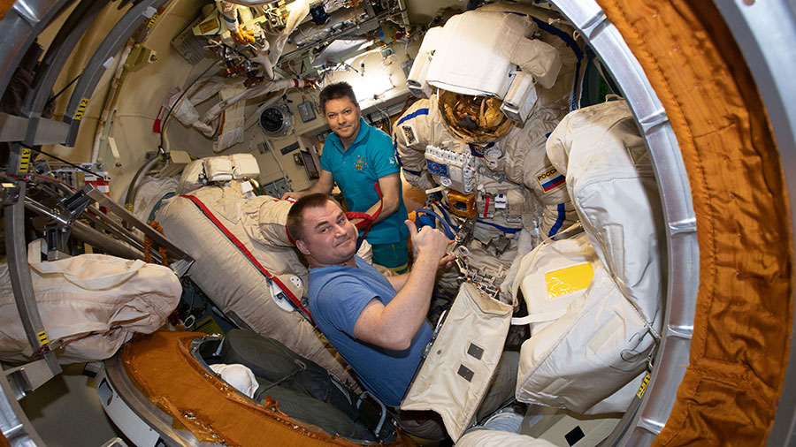 Expedition 59 commander Oleg Kononenko, making his fifth spacewalk, and crewmate Alexey Ovchinin, making his first, opened the hatch of the Pirs airlock compartment at 11:42 a.m. EDT to officially kick off what turned out to be a six-hour one-minute excursion, the year's fourth spacewalk and the first by the Russians.
