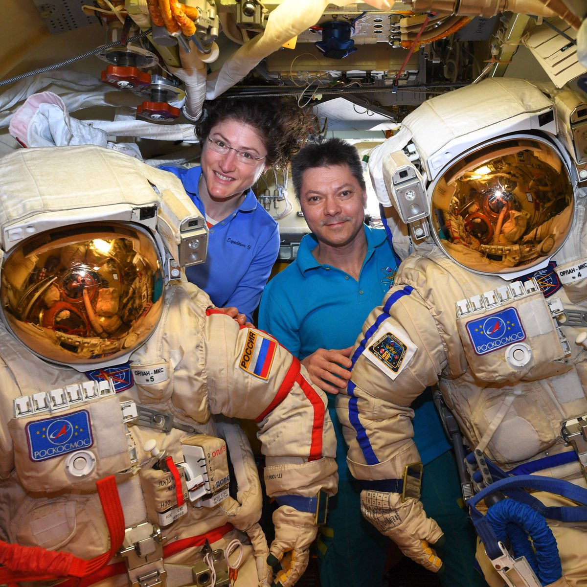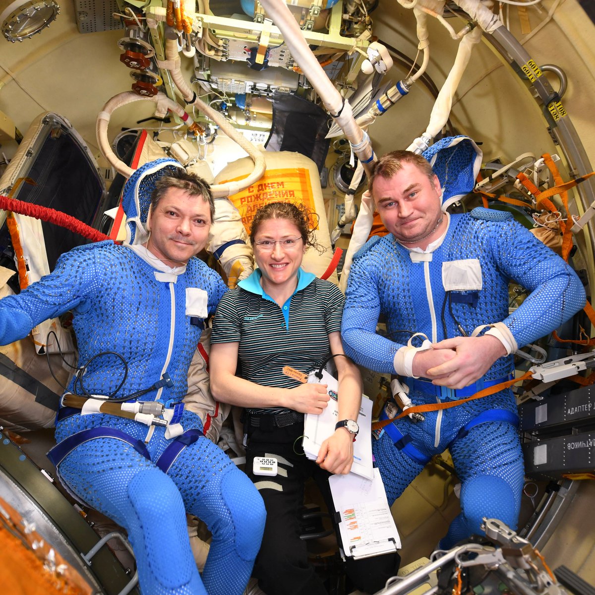 Christina Koch of NASA is helping cosmonauts Oleg Kononenko and Alexey Ovchinin clean up after the duo's spacewalk on Wednesday. She stowed the U.S. tools they used back in the Quest airlock while the cosmonauts serviced their Russian Orlan spacesuits in the Pirs airlock.