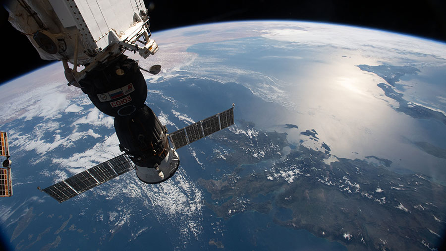 This view from the International Space Station looks from northeast to southwest, from Greece, Italy and across the Mediterranean Sea to Libya. The Soyuz MS-12 spacecraft is pictured in the foreground.