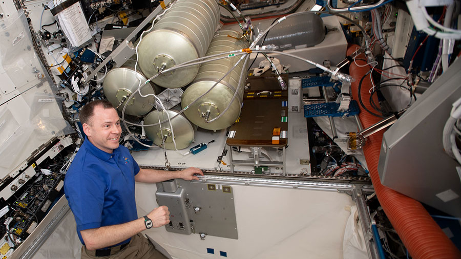 Flight Engineer Nick Hague spent the majority of Thursday installing Water Storage System components in the U.S. Destiny laboratory module. The space plumbing work consisted of installing a variety of hoses including power and data cables to the main Potable Tank Assembly.