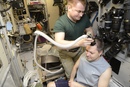 Station Commander Oleg Kononenko attached sensors to Flight Engineer Alexey Ovchinin today monitoring his vital signs during an exercise study to determine the most effective workouts in space. Ovchinin cleaned up afterward then researched plasma crystals, or highly charged micro-particles that form self-organized structures in microgravity. The duo also checked life support systems, configured communications gear and inspected the structural integrity of the station's Russian segment.