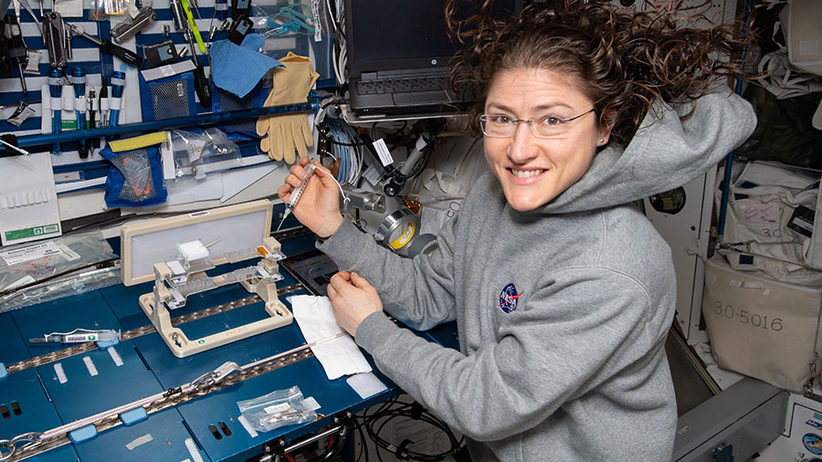 NASA astronaut Christina Koch works on the Capillary Structures experiment studying how to manage fluid and gas mixtures for more reliable life support systems in space.