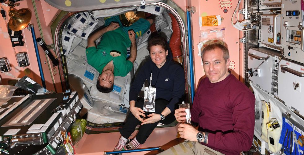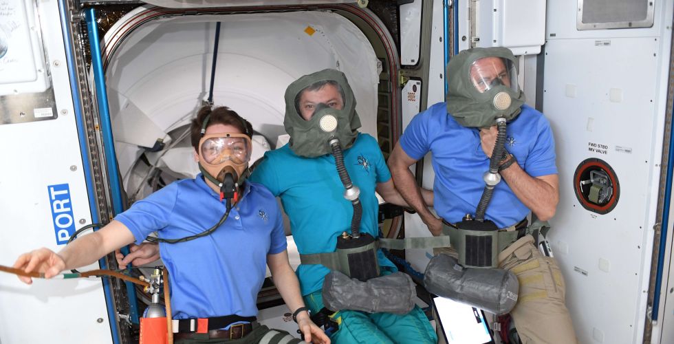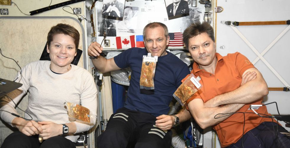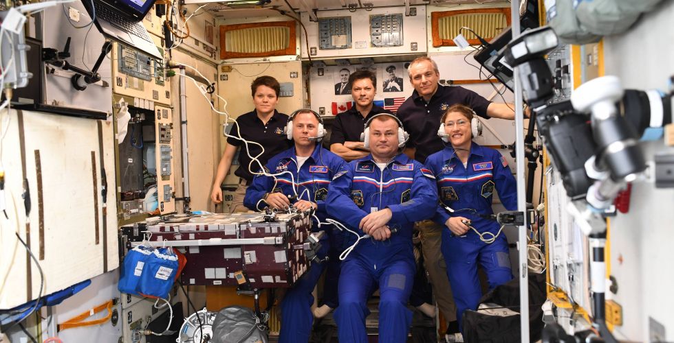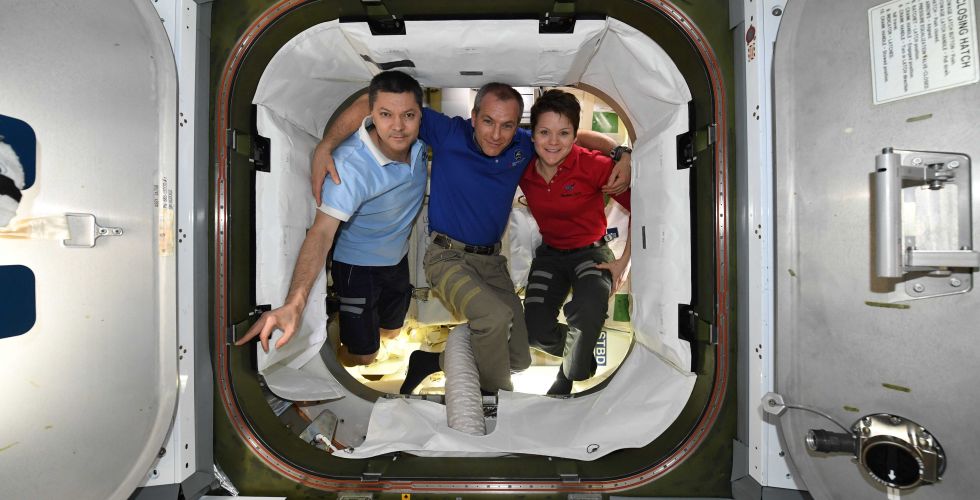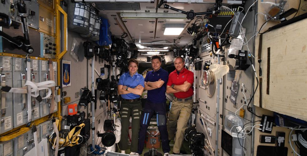 Expedition 59 crew members (from left) Anne McClain, Oleg Kononenko and David Saint-Jacques are wearing the Sokol launch and entry suits they will wear on the way back to Earth aboard the Soyuz MS-11 crew ship.