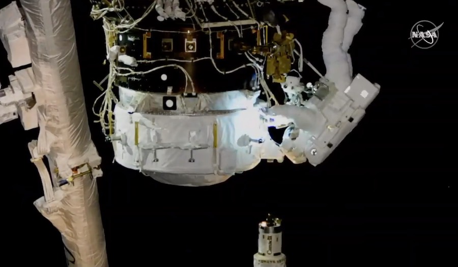 NASA astronauts Andrew Morgan and Nick Hague (out of view) helped install a new docking port on the International Space Station during a spacewalk Wednesday. Credit: NASA TV