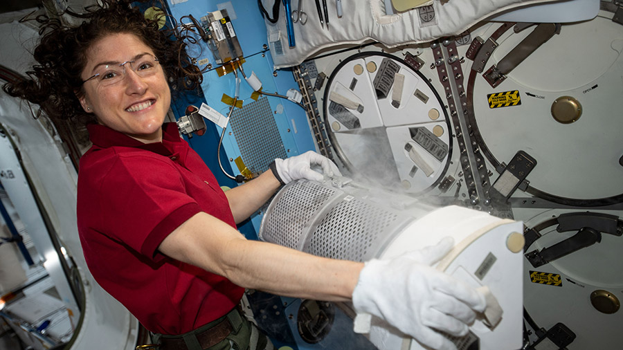 Flight Engineers Andrew Morgan of NASA and Luca Parmitano of ESA (European Space Agency) took turns today organizing spacewalking tools in the U.S. Quest airlock. Morgan also cleaned cooling loops inside the U.S. spacesuits he and fellow astronaut Nick Hague wore last week to install the International Docking Adapter-3.