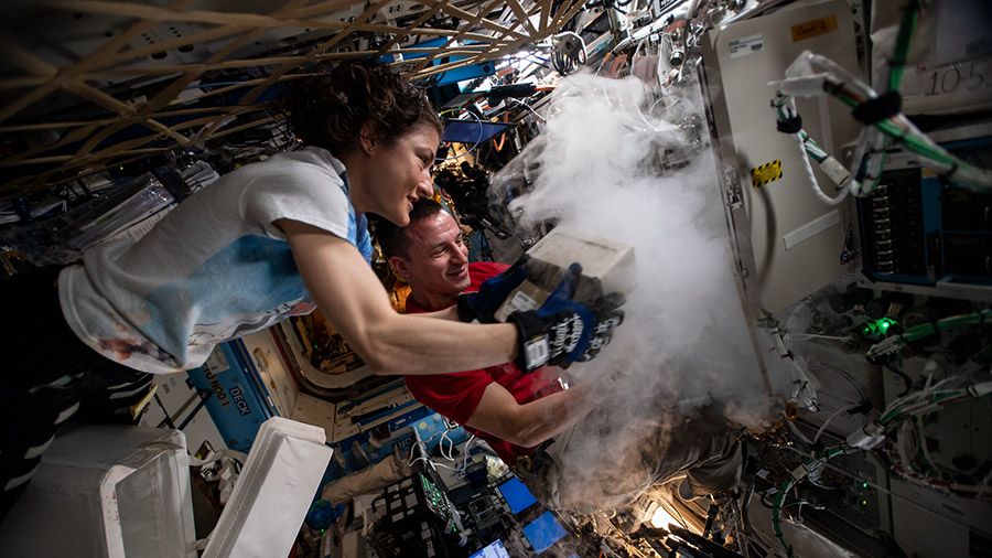 NASA astronauts Christina Koch and Andrew Morgan stow biological research samples into a science freezer located inside the U.S. Destiny laboratory module. Credit: NASA