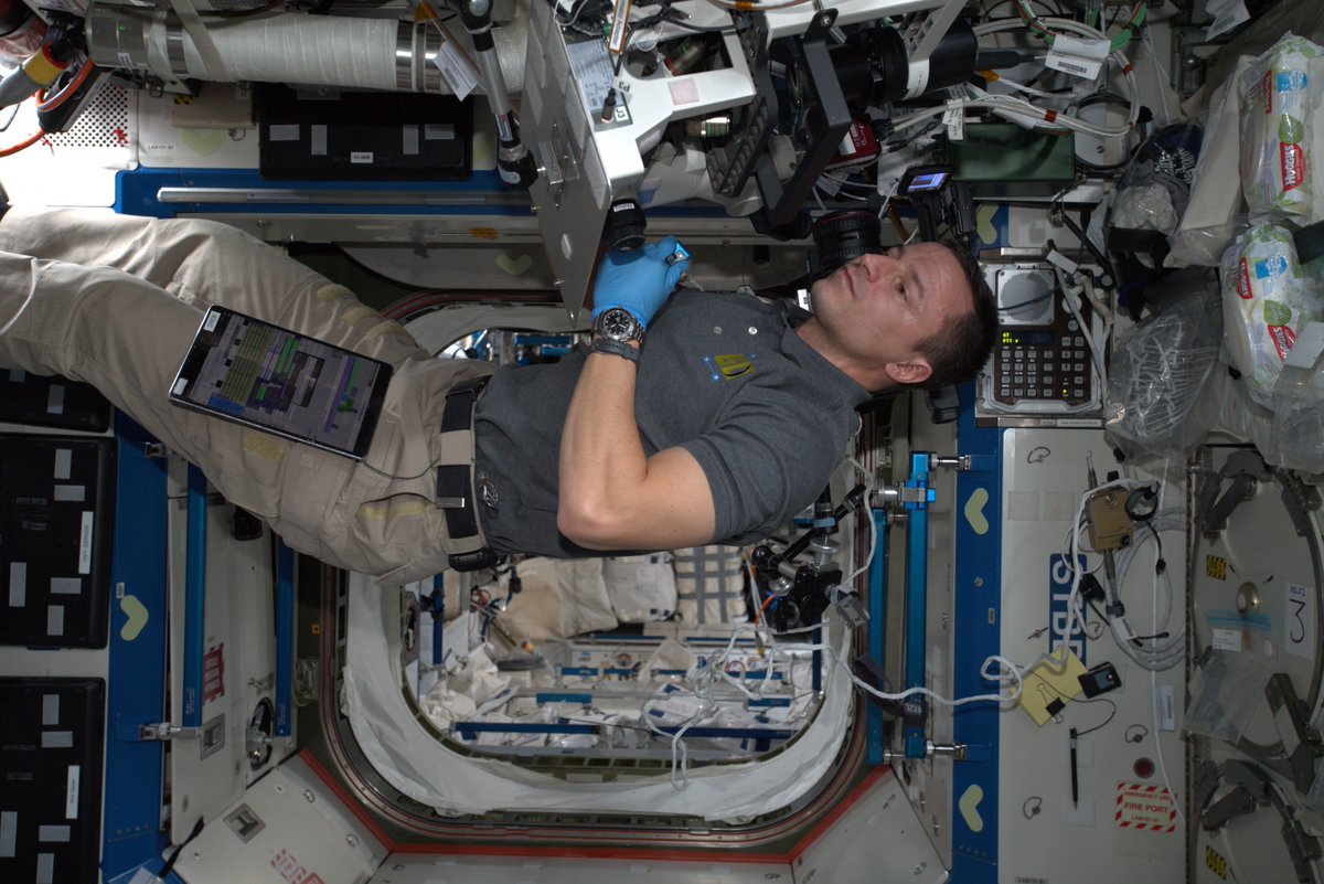 Astronaut Luca Parmitano of ESA (European Space Agency) started his morning playing with slime for the Non-Newtonian Fluids in Microgravity experiment. Koch and Morgan joined him for the fun research being filmed for students on Earth to excite them about space research.