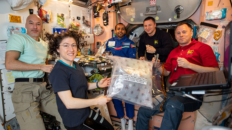 Four Expedition 60 crewmembers and a spaceflight participant gather inside the Unity module for a meal. Pictured from left are, astronauts Luca Parmitano of ESA (European Space Agency) and Christina Koch of NASA, spaceflight participant and United Arab Emirates astronaut Hazzaa Ali Almansoori and NASA astronauts Andrew Morgan and Nick Hague.