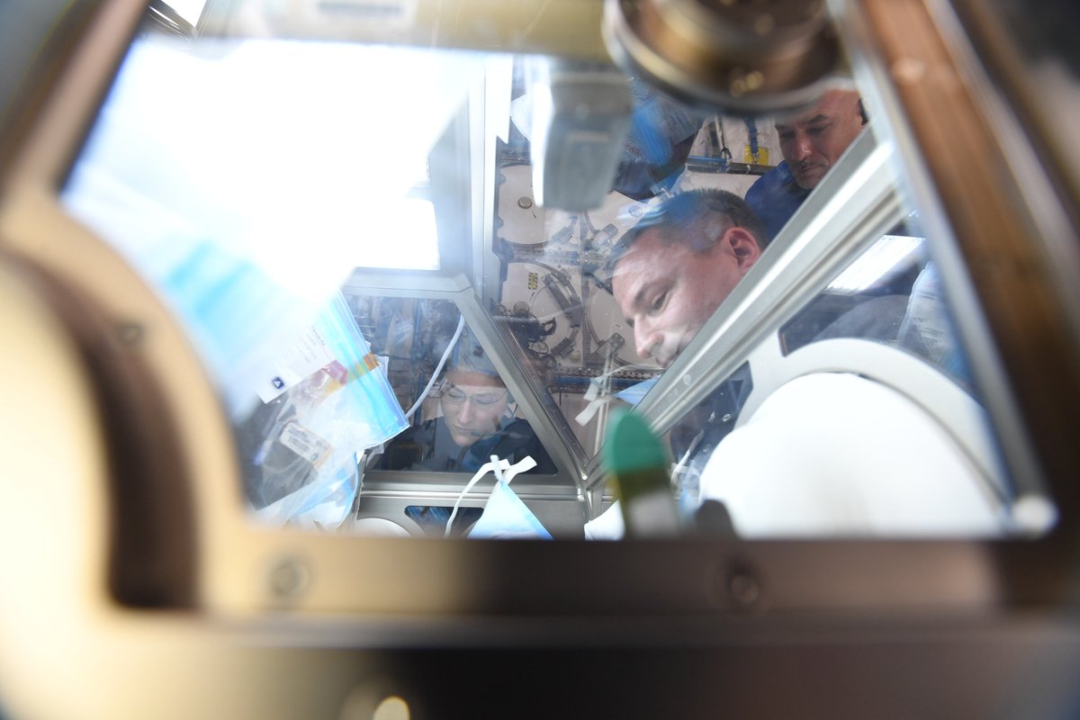The crew performed the first round of ops, which included opening clamps, mixing contents and taking photos. Some of the experiments in this Nanoracks Module 9 suite of investigations include seed sprouting, rusting of steel in various environments, bacterial growth, and protein crystal growth in microgravity. The experiments use NanoRacks MixStix, miniature laboratories which are activated by the ISS crew and are eventually returned to the student teams on Earth for analysis.