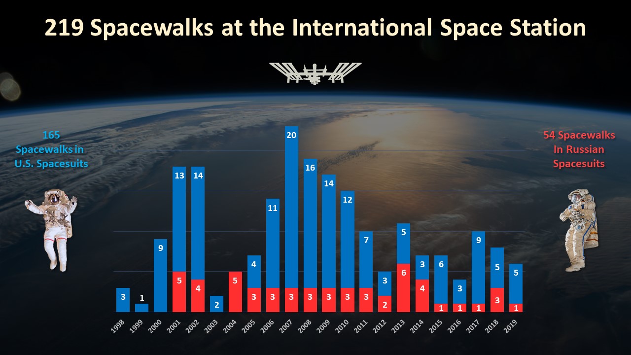 There have been 219 spacewalks at the International Space Station since December 1998, including six this year.