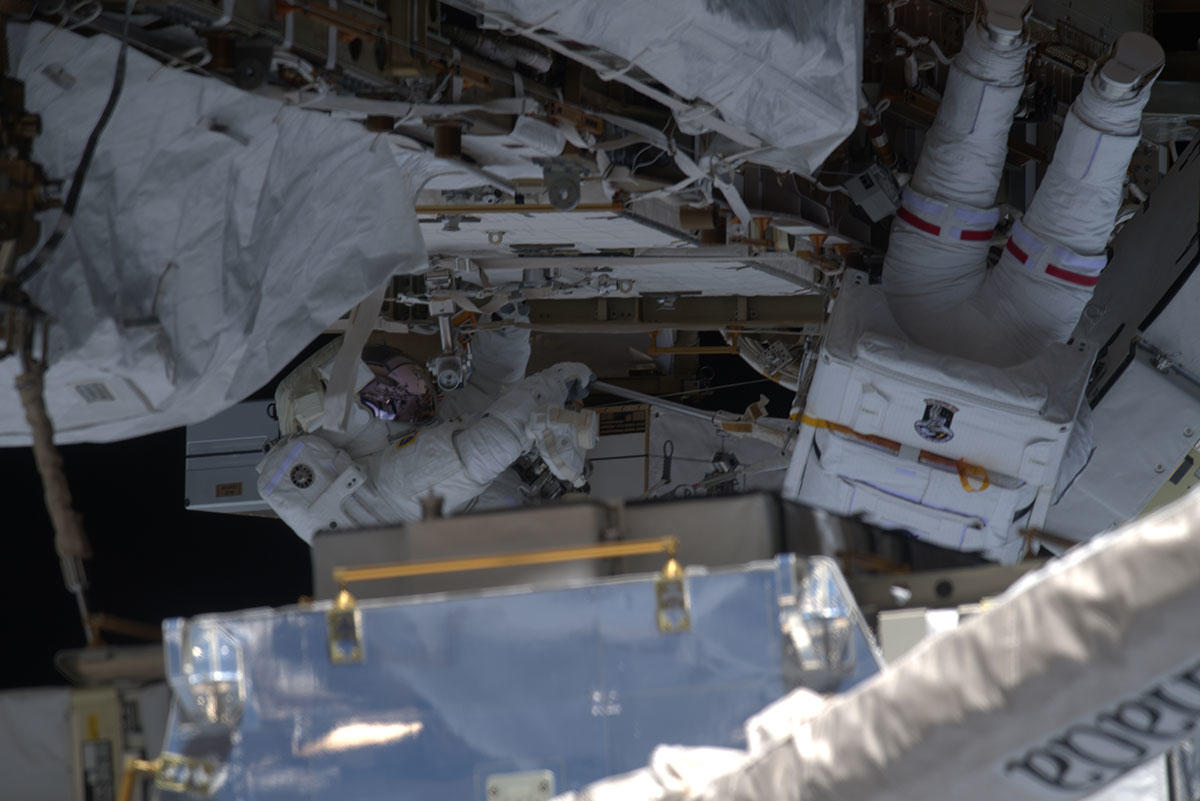 After exiting the Quest airlock, Koch and Morgan gathered tools and moved to the station's far port-side truss segment, or P6, to begin the battery replacement work.