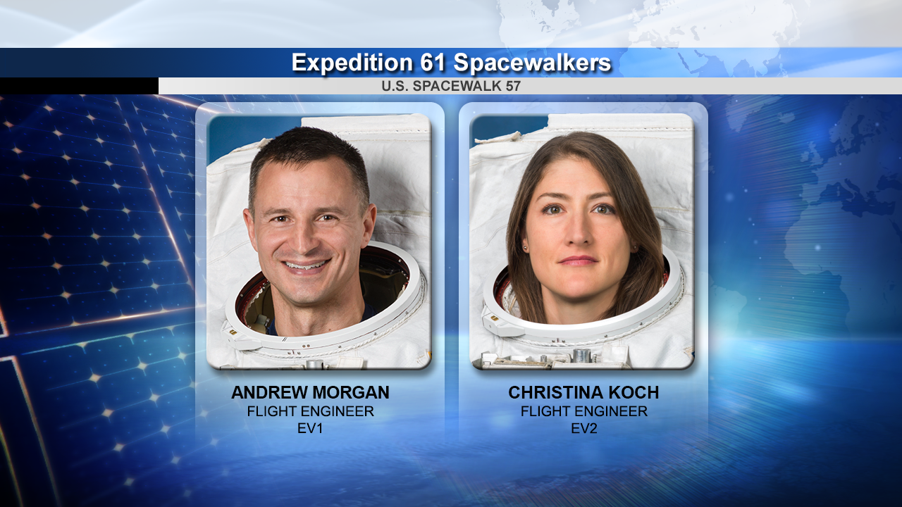 Expedition 61 Flight Engineers Andrew Morgan and  Christina Koch of NASA will continue the series of spacewalks outside of the International Space Station at about 7:50 a.m. EDT to upgrade the station's solar array batteries. Watch the spacewalk coverage now on NASA TV and the agency's website.