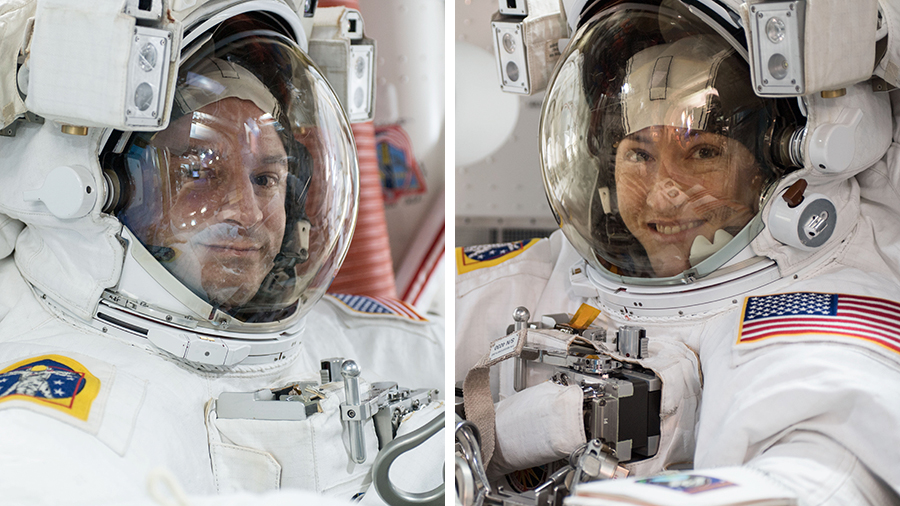 Astronauts Andrew Morgan and Christina Koch are pictured in their U.S. spacesuits during a spacewalk earlier this year