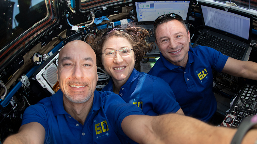 Astronauts (from left) Luca Parmitano, Christina Koch and Andrew Morgan are pictured at the robotics workstation inside the cupola, the International Space Station's "window to the world."