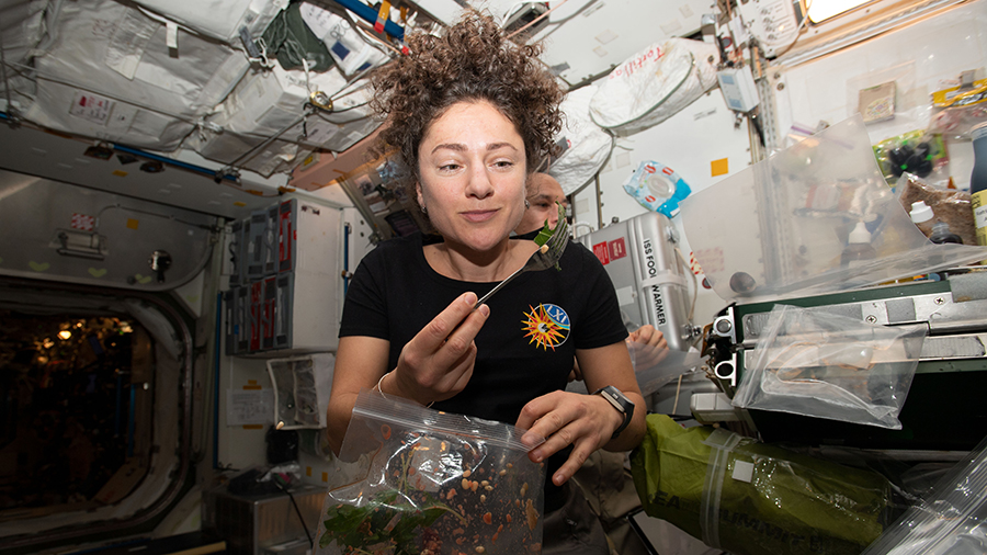 NASA astronaut Jessica Meir dines on fresh Mizuna mustard greens she harvested aboard the International Space Station.