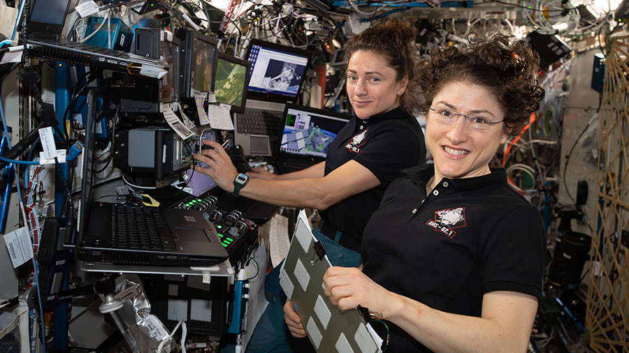 NASA astronauts (from left ) Jessica Meir and Christina Koch are at the robotics workstation controlling the Canadarm2 robotic arm to support the first spacewalk to repair the Alpha Magnetic Spectrometer.