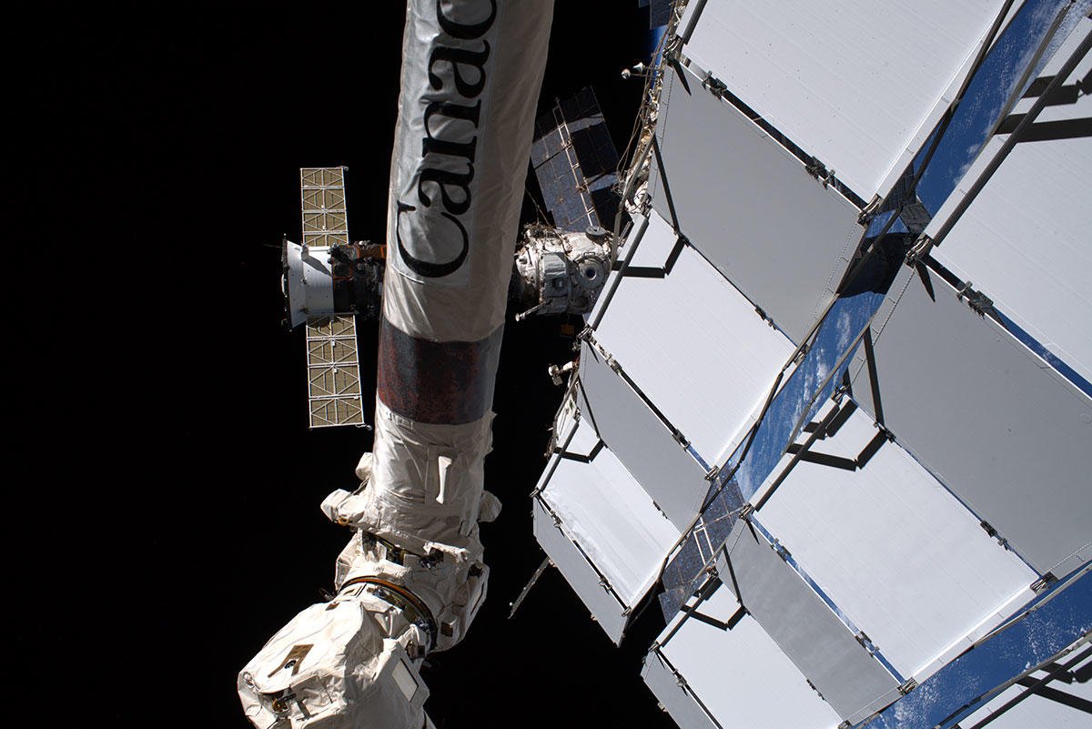While on the Canadarm2 robotic arm, I took a picture of the MRM2 (Mini-Research Module 2). At that exact, serendipitous moment, Oleg was also snapping a picture from the MRM2 window...