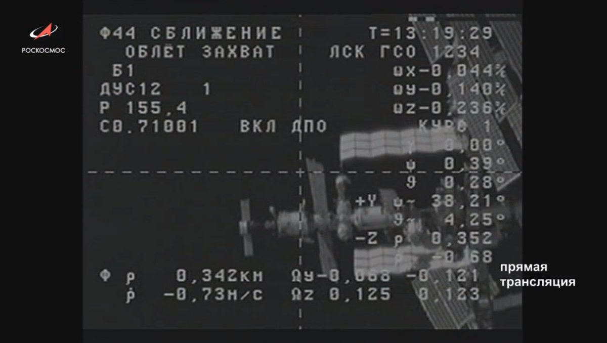 Стыковка выполнялась в автоматическом режиме под контролем специалистов Главной оперативной группы управления полётом российского сегмента МКС в Центре управления полётами и российских членов экипажа орбитальной станции.