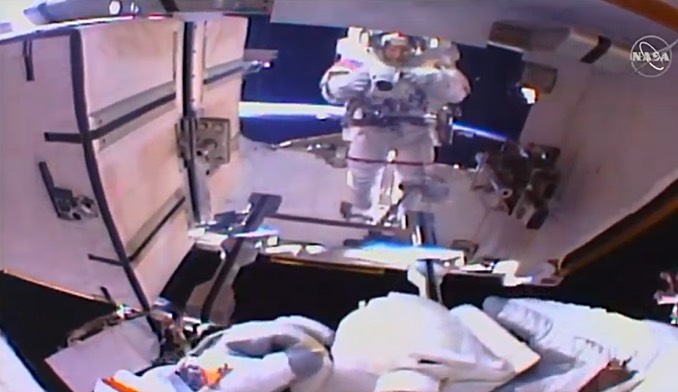 US EVA-64: Elapsed time: 1h 17m (07:52am): Jessica Meir, working at an external equipment pallet, snaps a photo of her reflection.