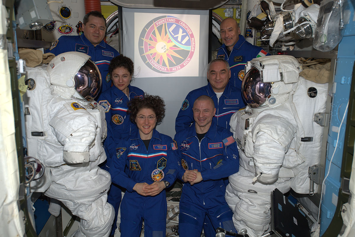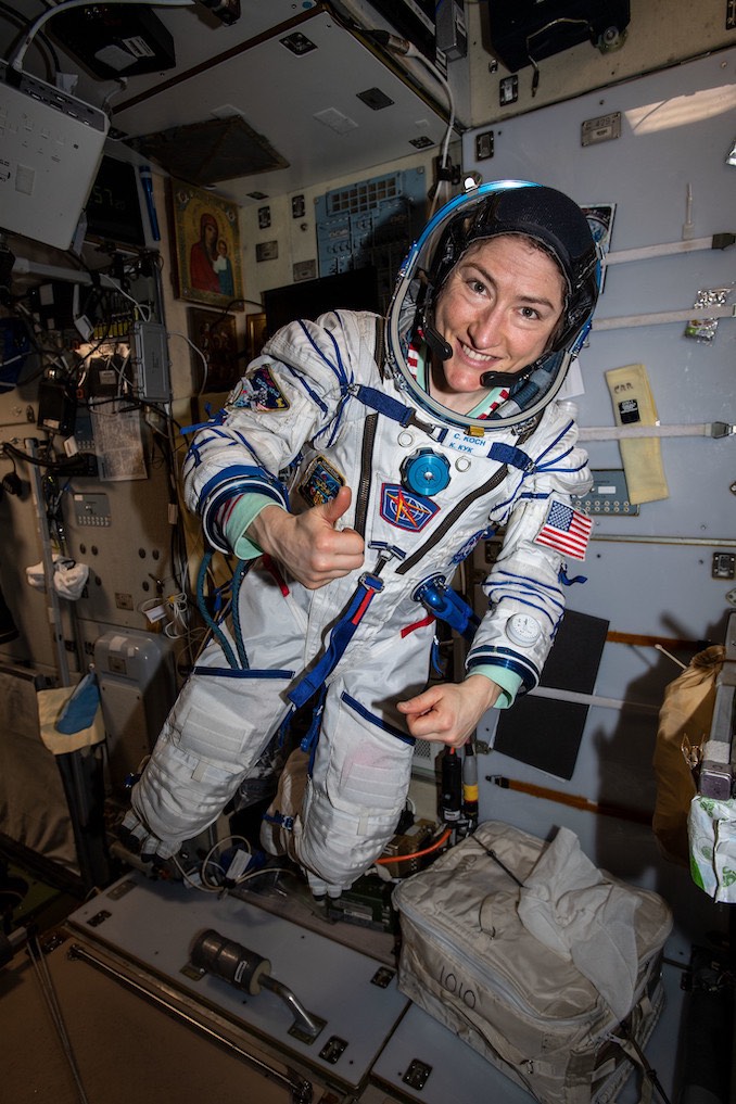 During her stay aboard the station, Koch participated in six spacewalks totaling 42 hours and 15 minutes. She and Meir carried out the first all-female spacewalk last Oct. 18, replacing a faulty solar array battery charge controller, and two more on Jan. 15 and 20 to complete work started last year to replace a set of solar array batteries.