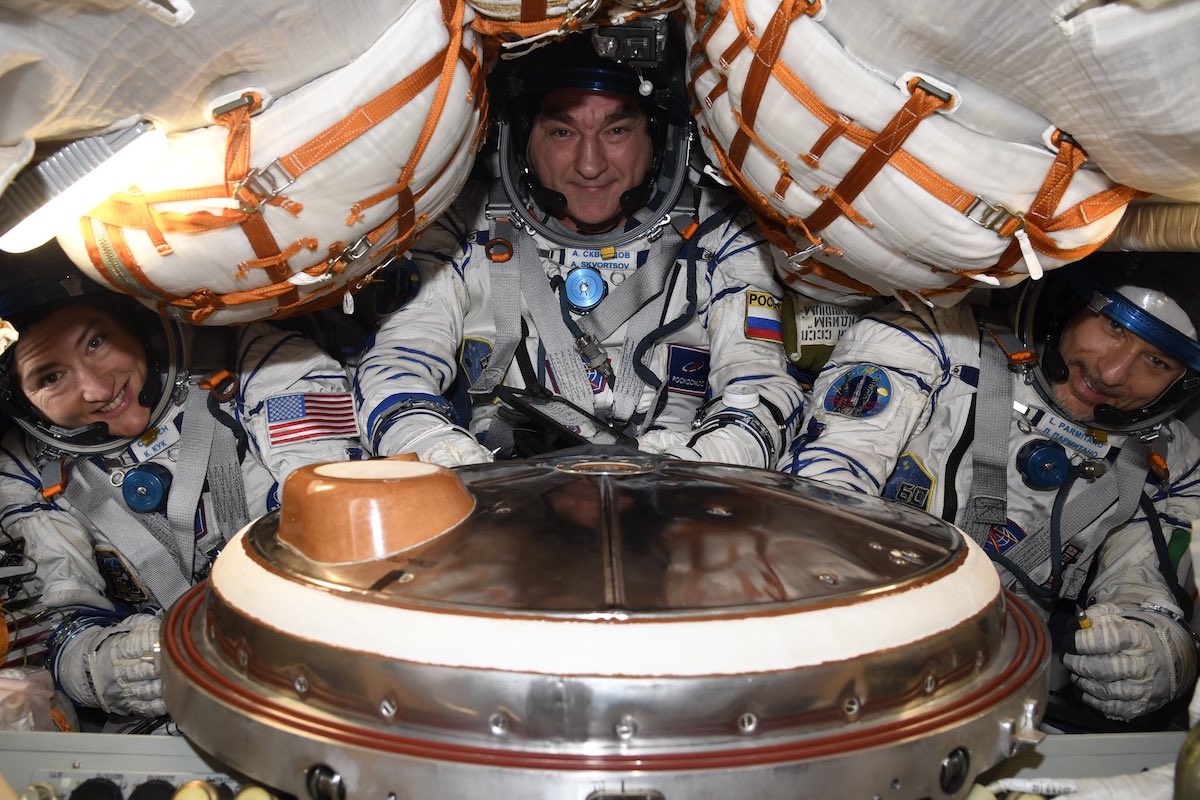 Astronaut Christina Koch, Soyuz commander Alexander Skvortsov and European Space Agency astronaut Luca Parmitano sit inside the Soyuz MS-13 spacecraft for pre-landing checks. Credit: NASA